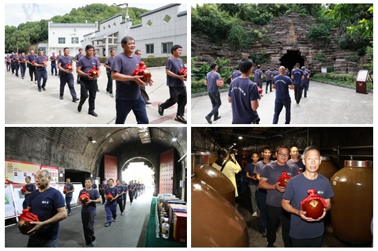 让时光入酒,以岁月藏香。稻花香以封藏之礼,致敬岁月与匠心。活动现场,秦玉龙、曾洋、谢永文、苏顺平、陈小林共同移步至台前,为凝聚天地精华与匠心智慧的美酒进行封坛。在所有人期待的目光中,酿酒师傅们应声上前,抱起覆上红绸的酒坛,如同护送珍贵的宝物一般,站成一条庄严的队伍,向着象征岁月与沉淀的藏酒洞方向进发。