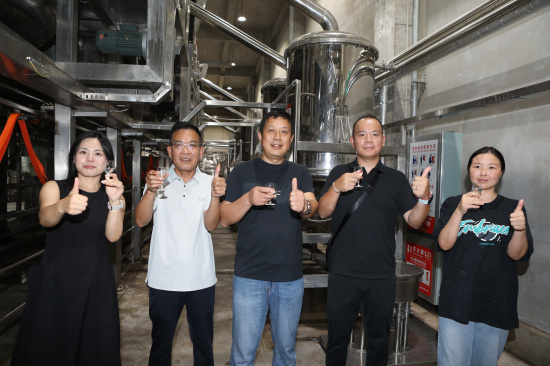 随着工序运行,在车间二楼的馏酒区,融合了清、酱、浓三香的风味升腾而起,弥漫在车间上空,让人未饮先醉。与会领导和嘉宾们近距离观摩酿酒师傅馏酒取酒,共同品鉴秋酿馫香头酒。大家举起酒杯,细细品味,充分感受“一品三香”的酒体特色,脸上流露出惊喜、赞叹与回味的神情,此刻馫香美酒成为连接匠人与消费者的美好桥梁。